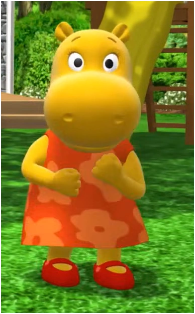Tasha is one of the main characters of The Backyardigans. Description[]Tasha is a deceptively sweet and girlish hippo who wears red Mary Janes and a flowered dress. A favorite playmate of Uniqua's, Tasha looks sweet as pie, but underneath her girly exterior beats a heart that's tough-as-nails. She is rational, skeptical, and highly motivated to get her way. Tasha and Uniqua are always giggly, silly, and full of fun when they are together. Looks[]Tasha is mostly yellow. She has white eyes with black pupils and orange eyelashes. Her normal attire consists of an orange dress with a flower pattern and two red Mary Jane shoes. Appearances[]Tasha appears in many episodes of The Backyardigans. She debuted in "The Yeti," and was last seen in "The Tale of the Not-So-Nice Dragon."